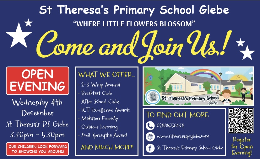 St. Theresa's P.S. stands in the middle of the Glebe Community as a focal point and we want each child to reach their full potential, in a secure and happy environment. Therefore, the distinctive ethos of St. Theresa’s is to ensure everyone feels welcomed and belongs here. This website will illustrate how children learn with enjoyment and how good humour permeates everything going on.